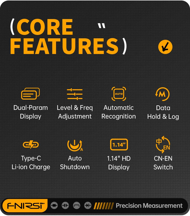 - Frequenze di test multiple: Offre tre frequenze di prova: 100 Hz, 1 kHz e 10 kHz, con livelli di prova di 0,3 V e 0,6 V RMS.
